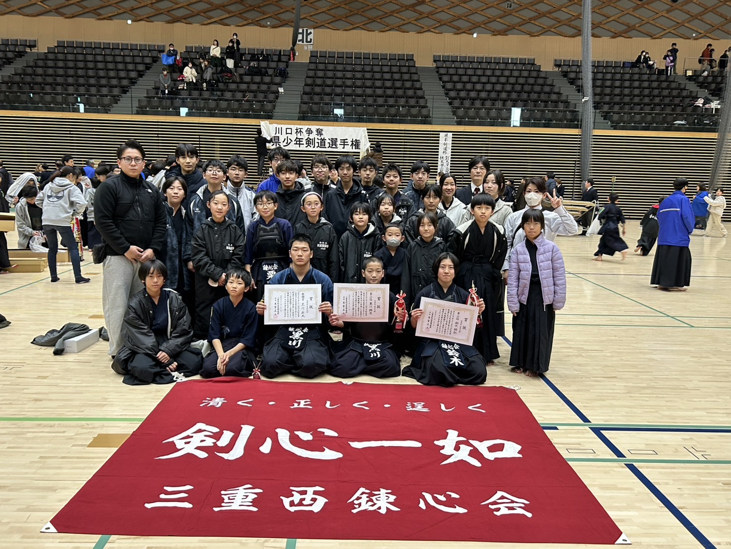 第38回川口杯争奪少年剣道大会 12月21日(日)、三重県の剣士の年末の大イベント、川口杯争奪少年剣道大会が四日市総合体育館で開催されました。 結果は 中学生男子の部で、黒川詢君がベスト4☆☆黒川新君がベスト8☆ 中学生女子の部で、鈴木さんがベスト8☆ おめでとうございます! 特に準々決勝の兄弟対決はしびれましたね。公式戦では初めての対戦かな。入賞できなかった子も熱戦が多く充分に楽しませて思います(^.^)/ コート登板をしていただいた父兄の皆様、大会関係者の方々、本当にありがとうございました。