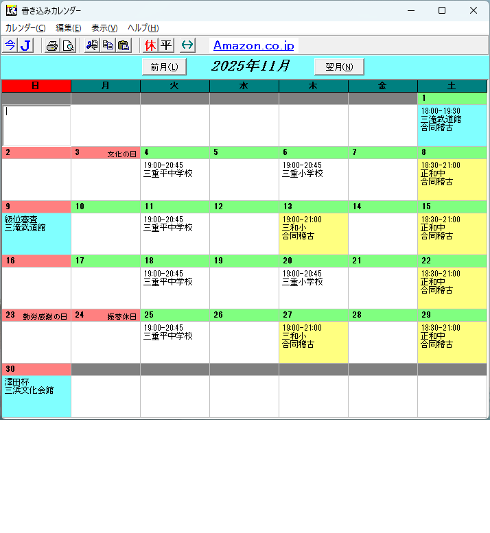 2025年11月の稽古予定日 11月になりました。旧暦で霜月とも言います。言葉通り寒くなってきましたね。インフルエンザも流行っています。毎年恒例年末は昇級審査、昇段審査、試合とイベント目白押しですが、体調管理に気をつけて稽古頑張りましょう! ■イベント 11/9(日) 昇級審査(三滝武道館) ■試合 11/30(日) 澤田杯争奪戦(三浜文化会館) 木曜は東員剣道さん、土曜は久米剣道さんと合同稽古があります。お気をつけください。
