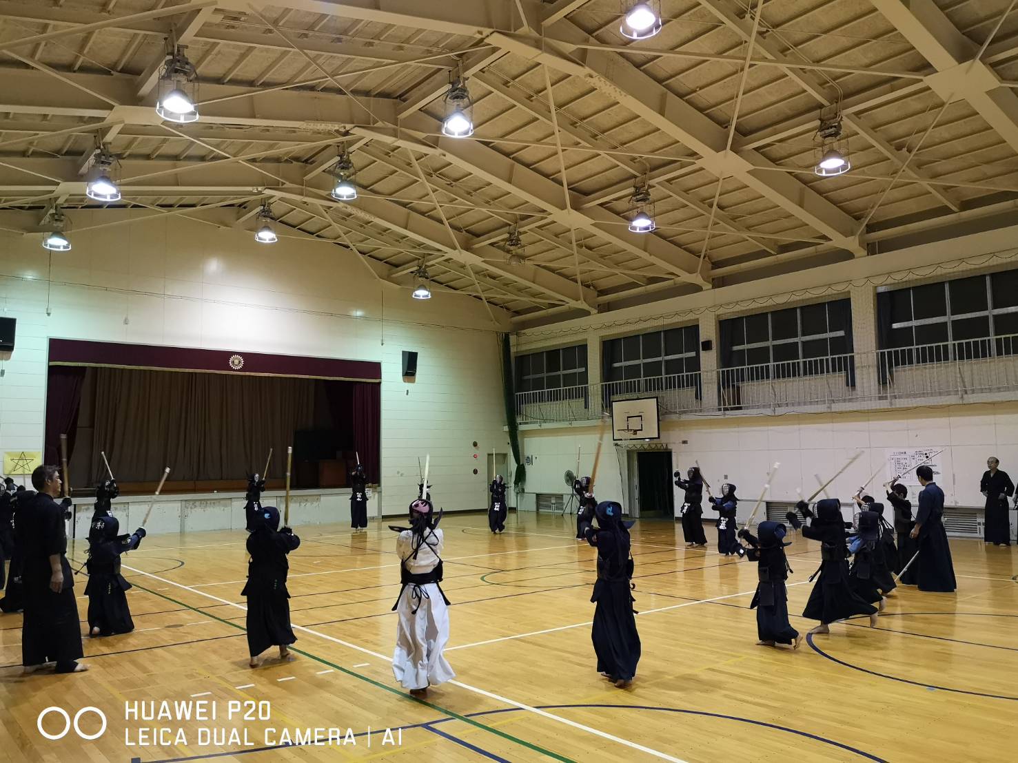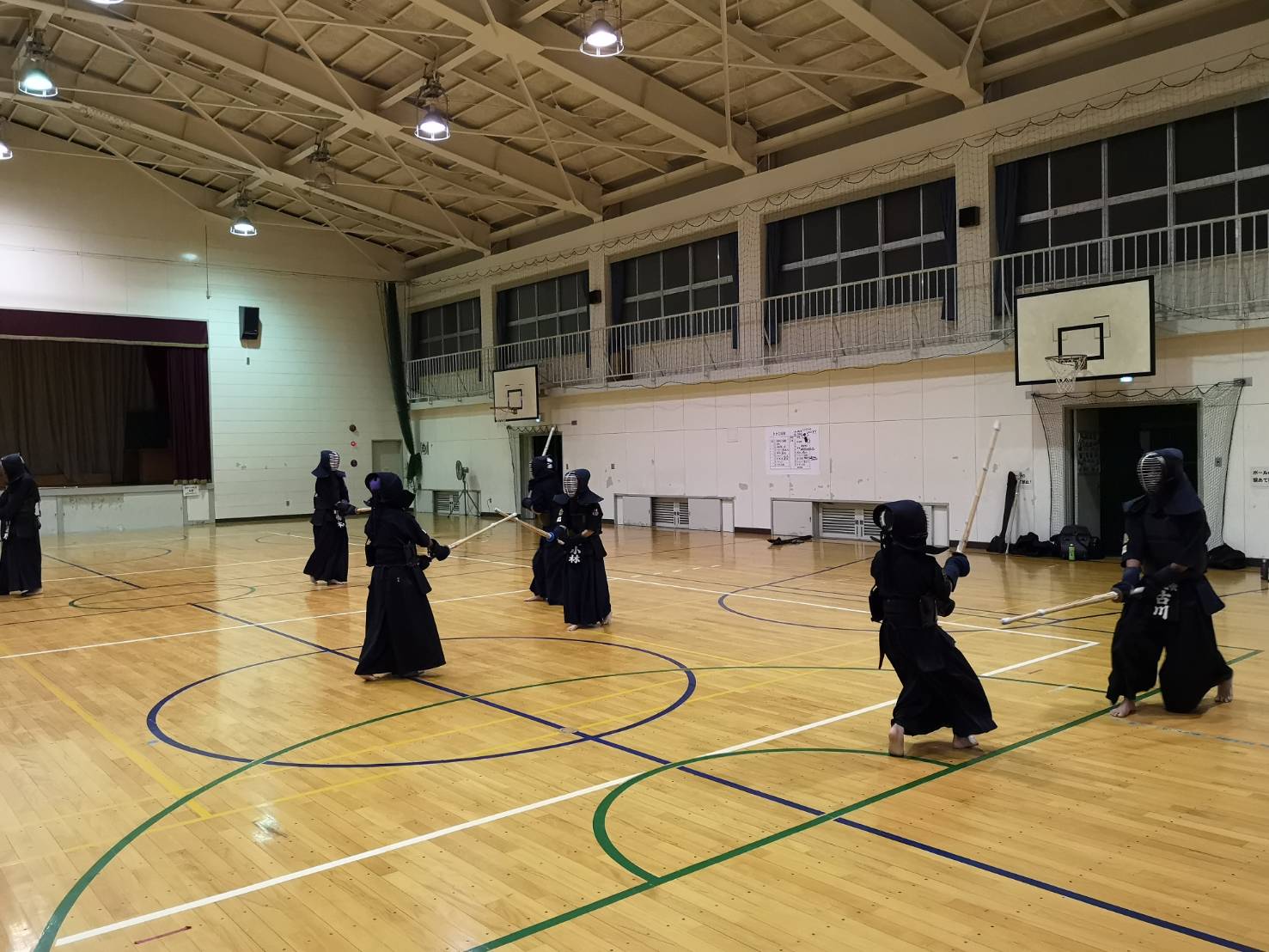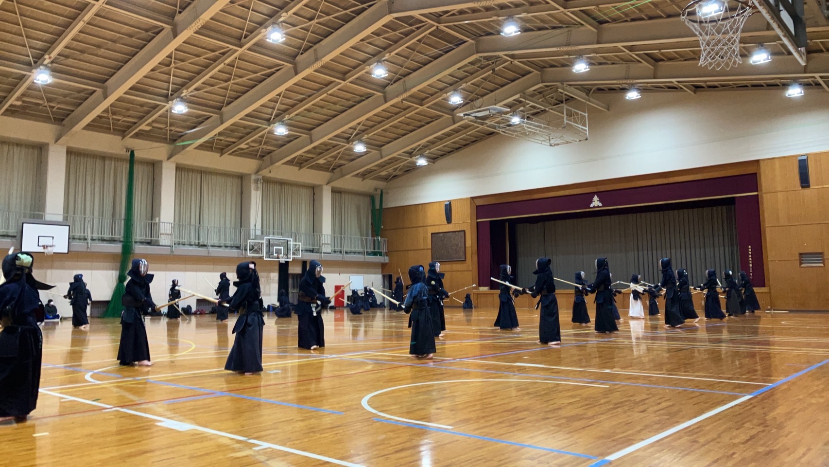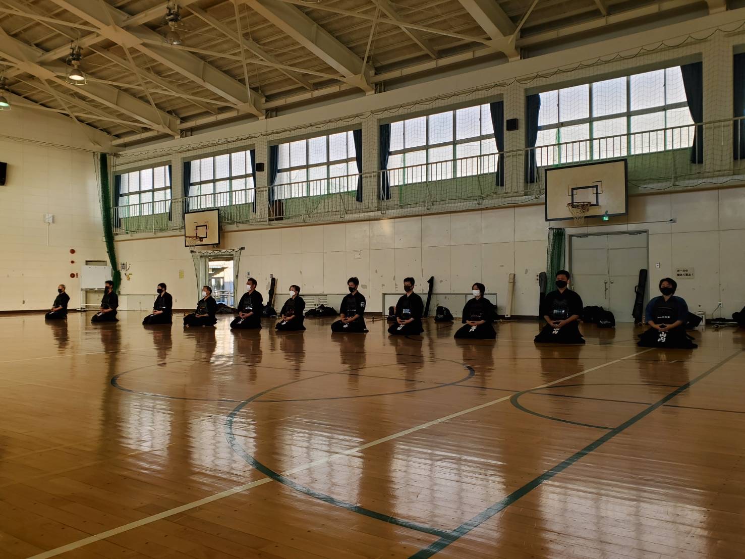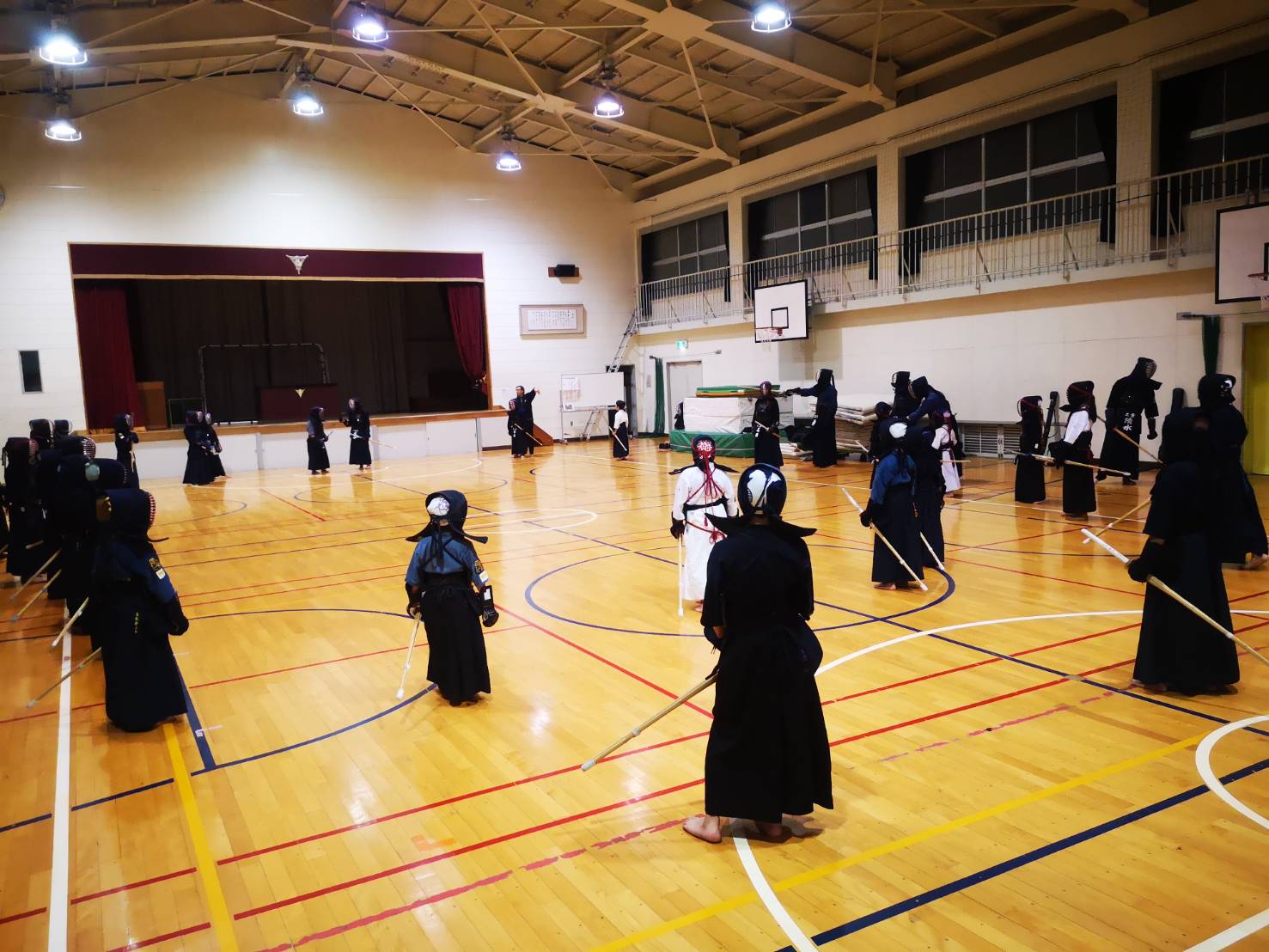 前半は先生方と一緒に基本稽古、後半は試合稽古と最後に先生方を元立ちにかかり稽古。