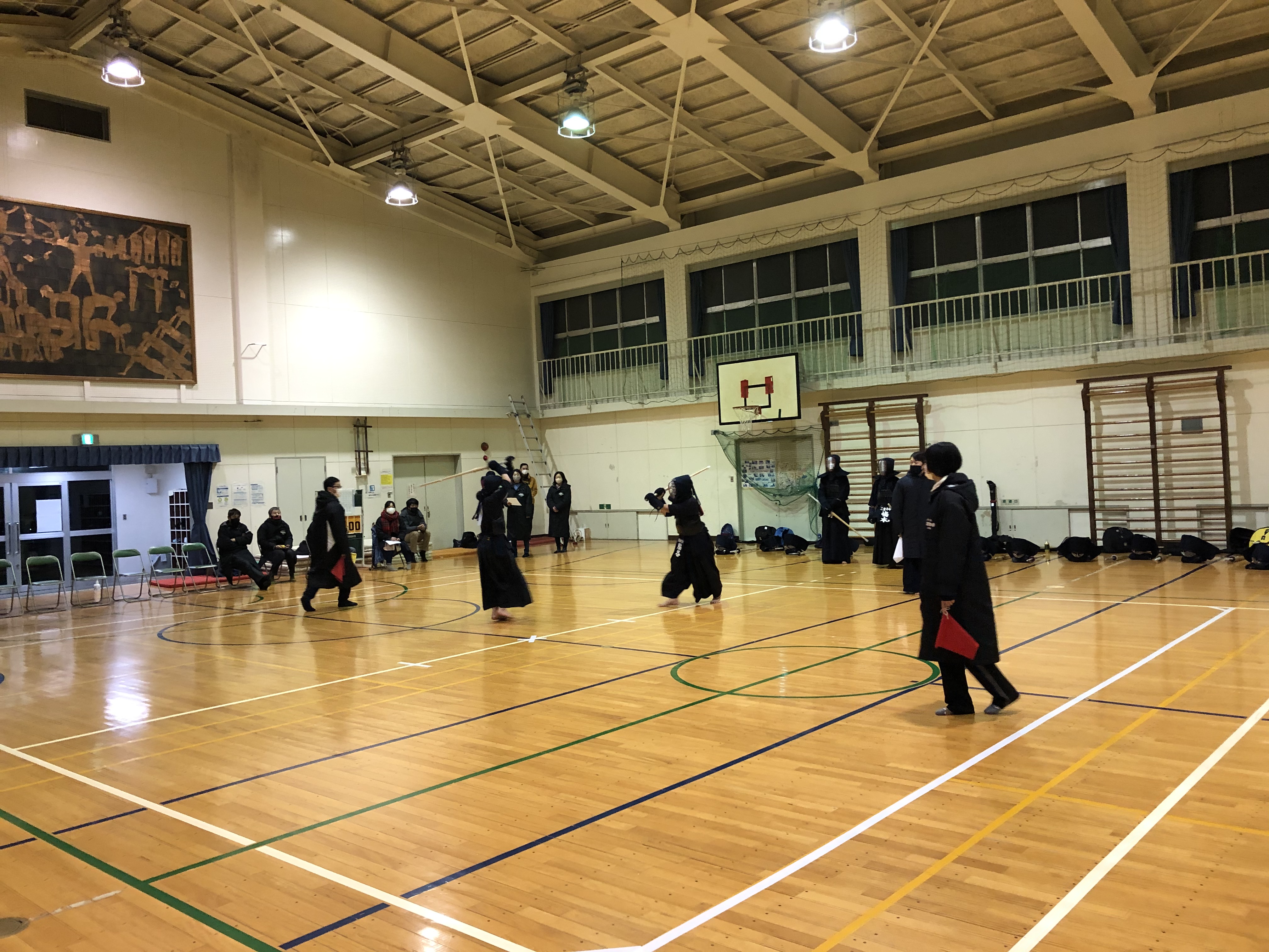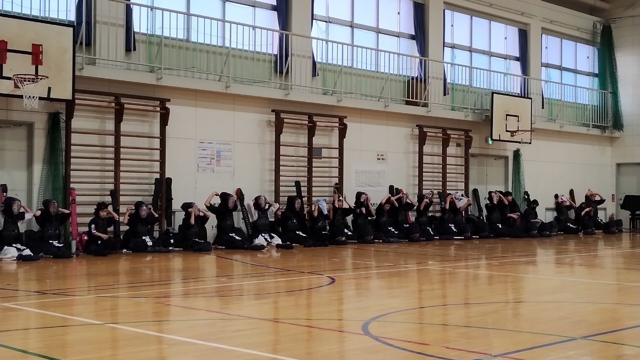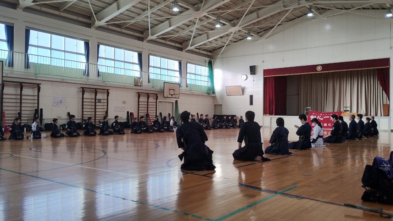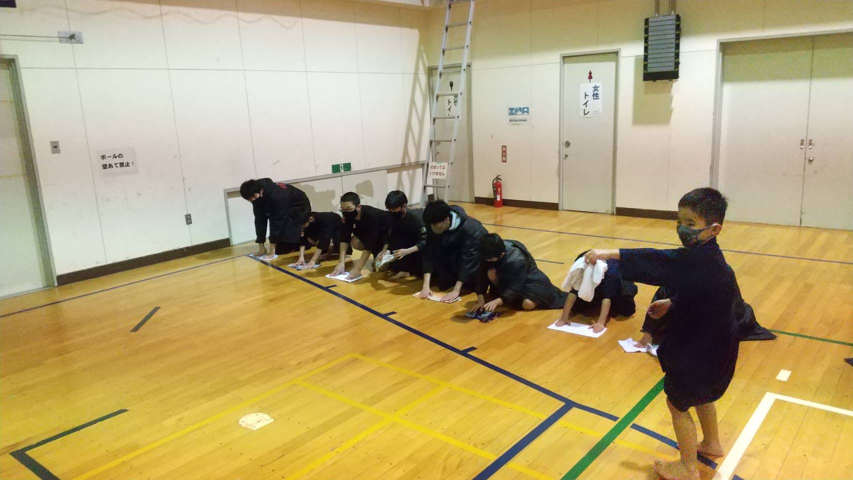 前半は先生方と一緒に基本稽古、後半は試合稽古と最後に先生方を元立ちにかかり稽古。