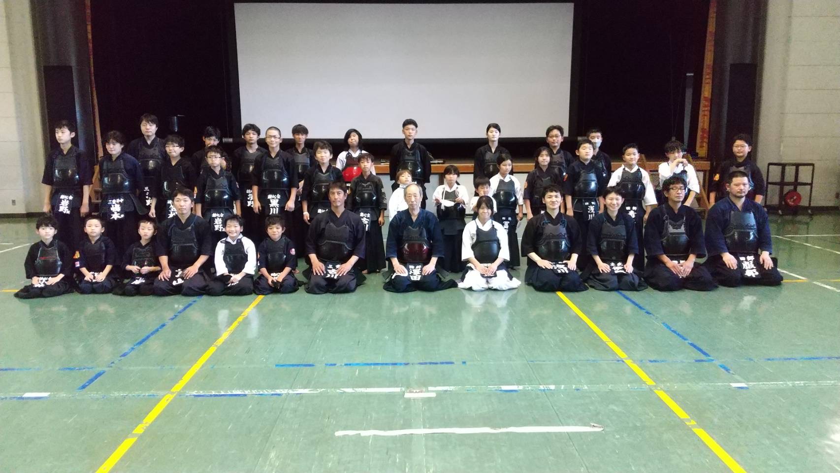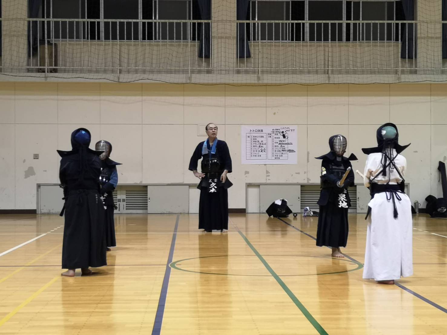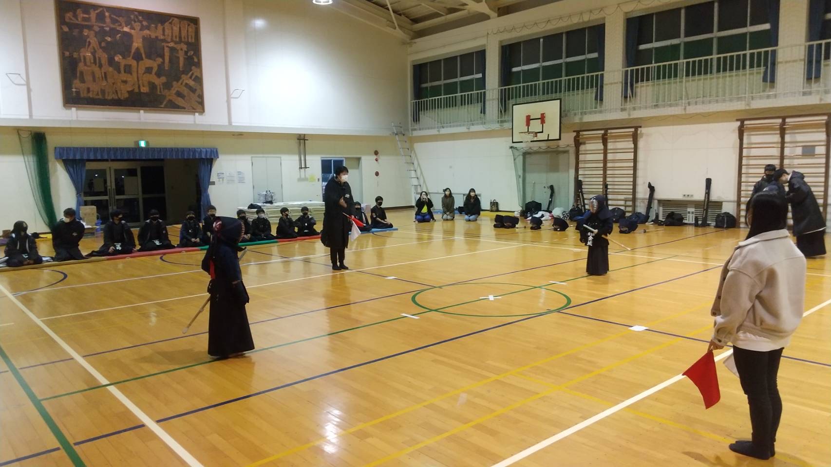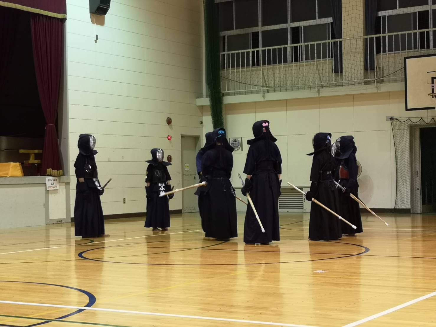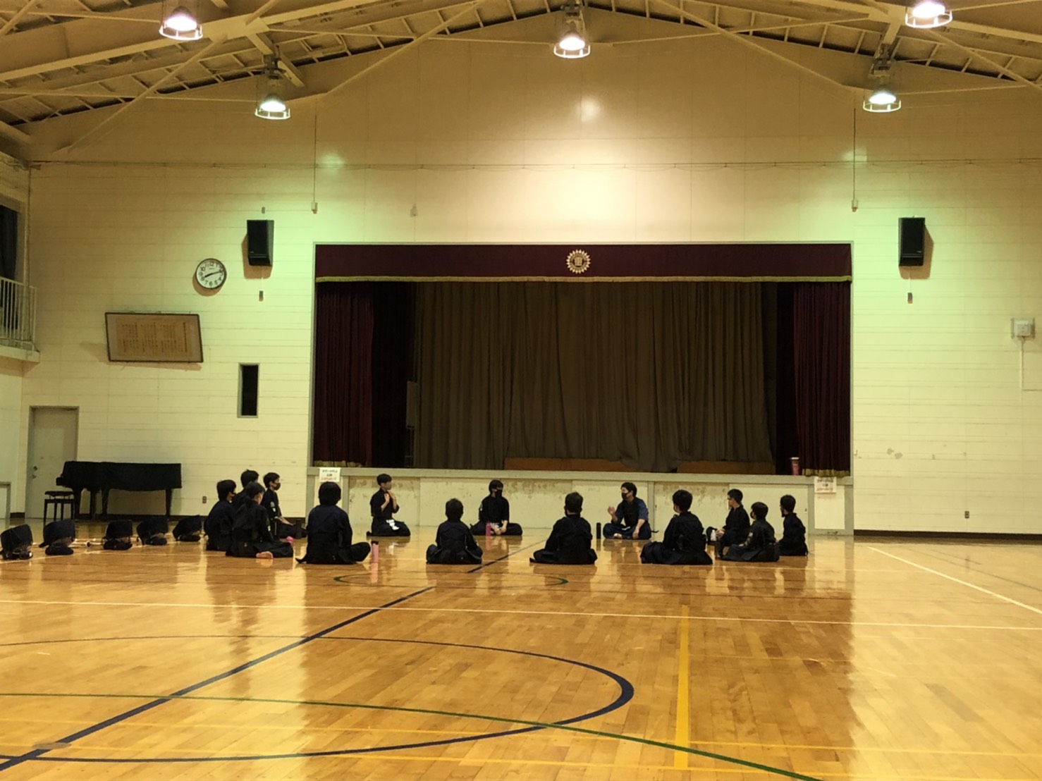 前半は先生方と一緒に基本稽古、後半は試合稽古と最後に先生方を元立ちにかかり稽古。